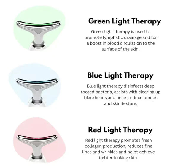 - Let the soothing lights of red, blue, and green LEDs work their magic. Red light revitalizes collagen, reducing fine lines and wrinkles, while blue light tightens your skin and improves its texture. Green light enhances cell oxygen utilization, promoting healthy circulation and balanced skin.