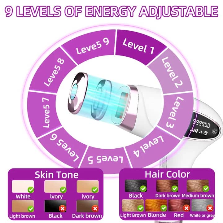- 9 ENERGY LEVELS & DUAL MODES: Featuring 9 adjustable energy levels, start at the lowest and find your ideal setting, reaching up to 15J. Choose between automatic mode for larger areas like arms and legs, and manual mode for smaller areas like underarms, bikini line, lips, and chin